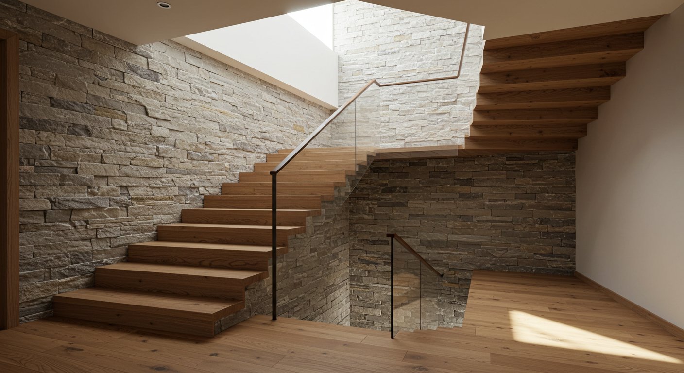 Комбинация дерева и камня в лестничных конструкциях – это не просто модное дизайнерское решение, а способ создать долговечную, эстетически привлекательную и функциональную лестницу. Такое сочетание материалов позволяет объединить природную теплоту и текстуру дерева с прочностью и солидностью камня, создавая гармоничный и выразительный интерьер. Деревянные элементы придают лестнице уют и мягкость визуального восприятия, а каменные ступени или облицовка обеспечивают долговечность, устойчивость к износу и уникальный архитектурный акцент.