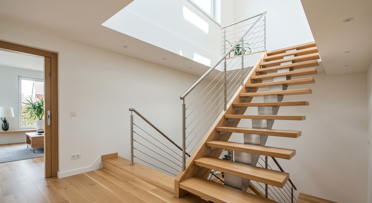 Кроме визуальной функции, дизайнерские решения позволяют учитывать освещение, высоту потолков и планировку комнат. Например, лестницы с подсветкой ступеней или скрытыми LED-полосами гармонично интегрируются в интерьер, создавая мягкий световой эффект и визуально расширяя пространство. Использование натуральной древесины в сочетании с современными элементами придает дому уют и ощущение природной теплотой.
